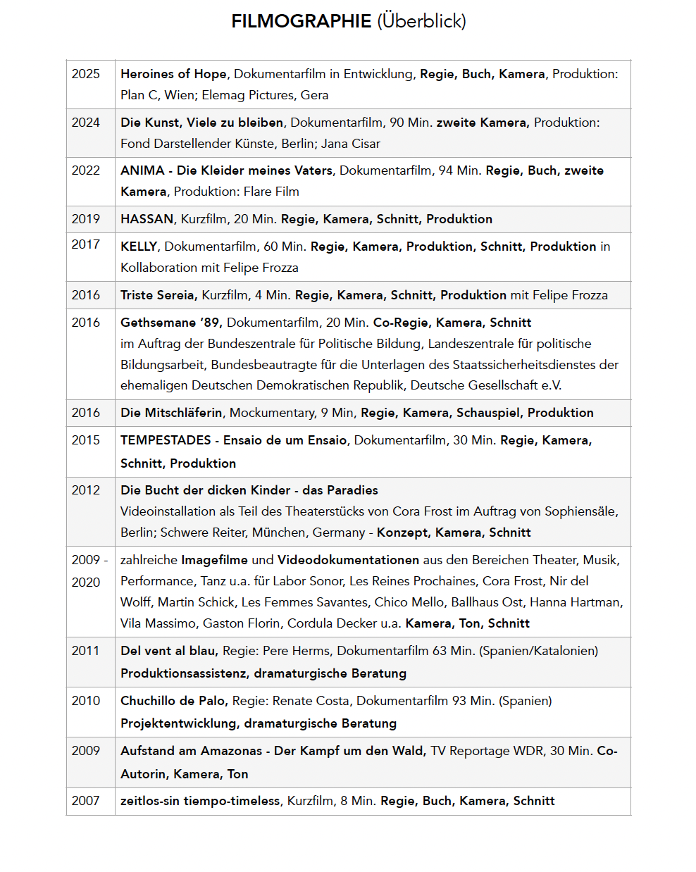 My most recent work—the hybrid documentary ANIMA – My Father’s Clothes, which premiered in 2022—has won numerous national and international awards and was featured at festivals both in Germany and abroad.